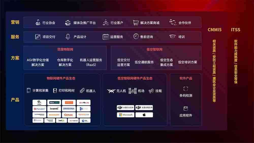 聚合国内外先进的物联网硬件产品品牌,,,,聚焦数字化仓储、、机器人运营、、低空智联网等领域,,,共同打造适合客户业务场景的解决方案并提供交付服务